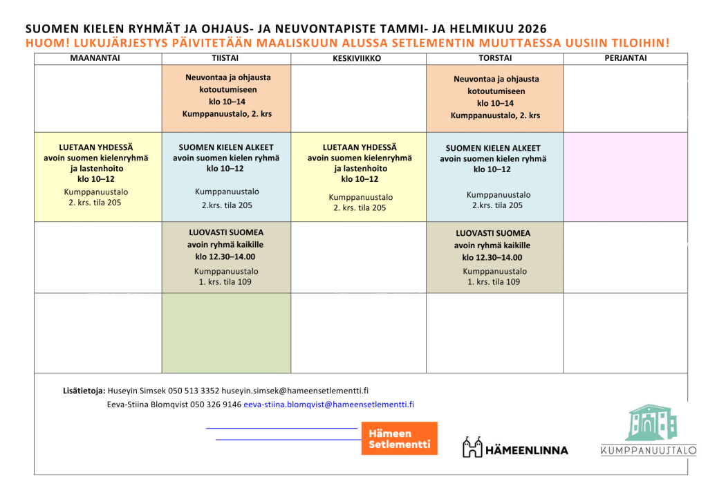 Ryhmissä opetellaan suomen kielen alkeita helposti sekä tutustutaan suomalaiseen yhteiskuntaan ja kulttuuriin yhdessä. Ryhmiin voi osallistua milloin vain, ei tarvitse ilmoittautua ennakkoon.